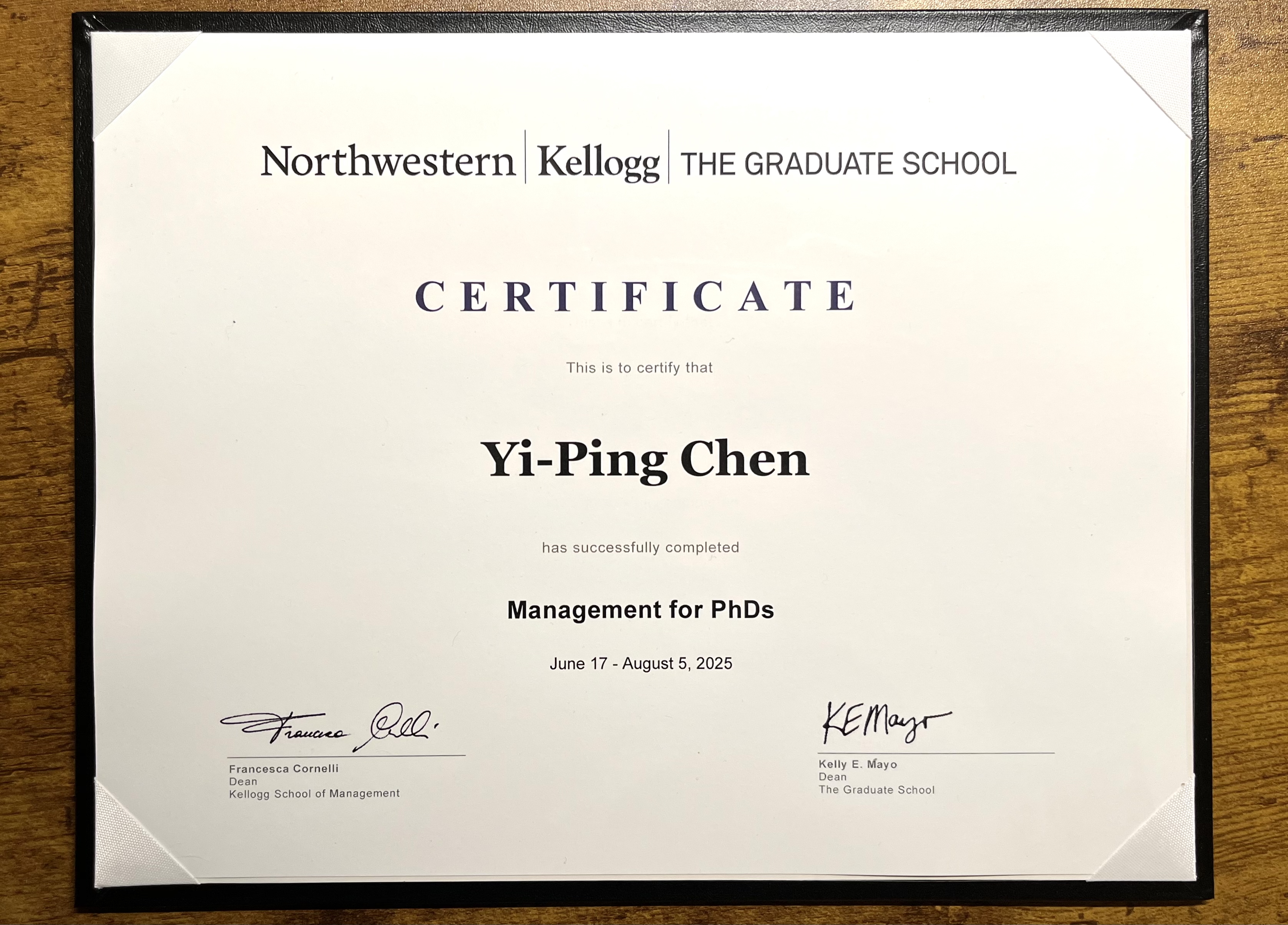 Yi-Ping has been accepted into the 2025 Management for PhDs Certificate Program offered by Kellogg School of Management.