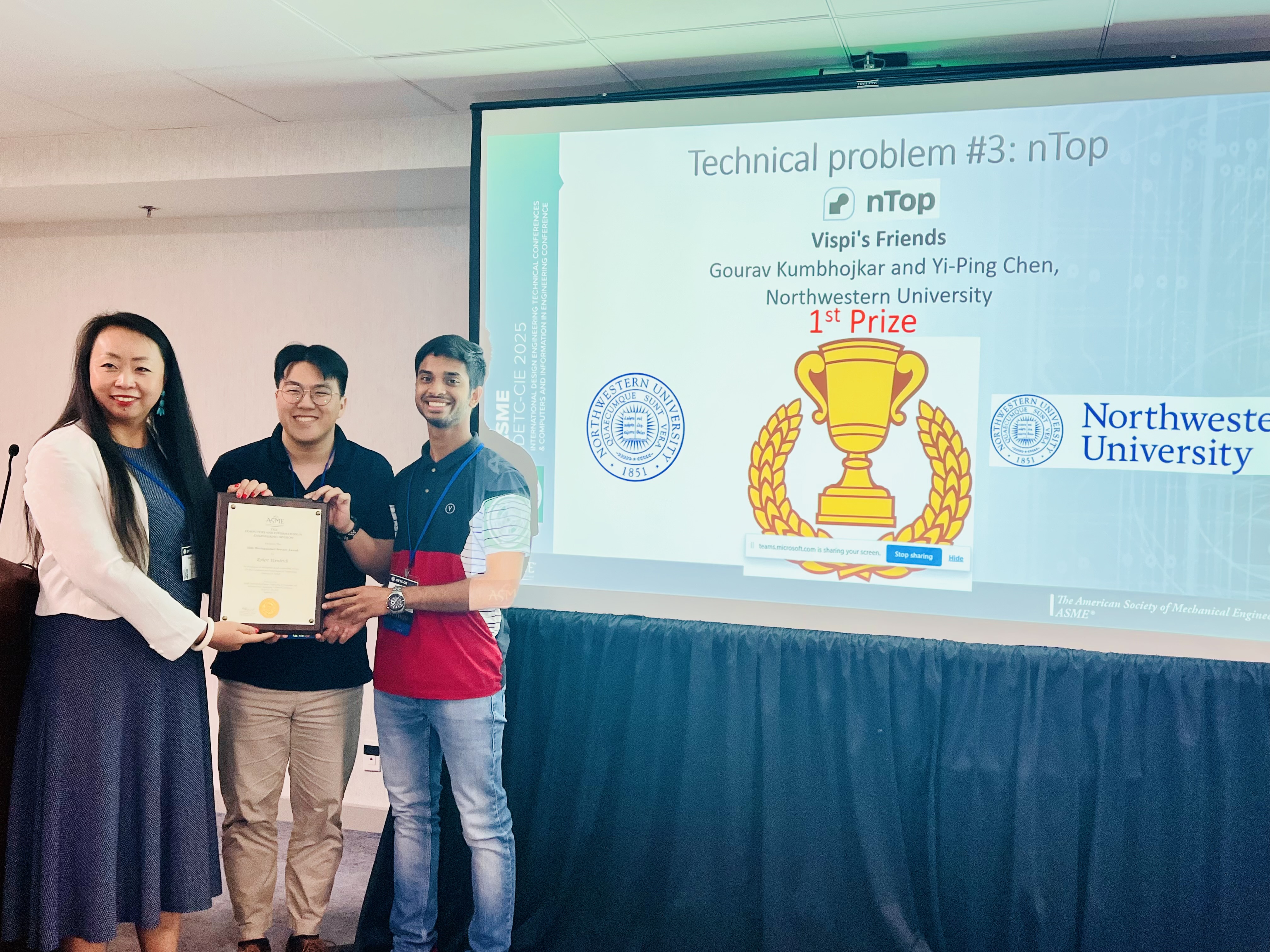 Yi-Ping and Gourav teamed up to win the 2025 ASME IDETC-CIE Student Hackathon on the ntop problem. The performance is evaluated based on surrogate model accuracy, inverse design quality, and technical presentations. They fully utilized the active learning perspective in both sampling and optimization, allowing the design window to be shrinked and identify a better design.